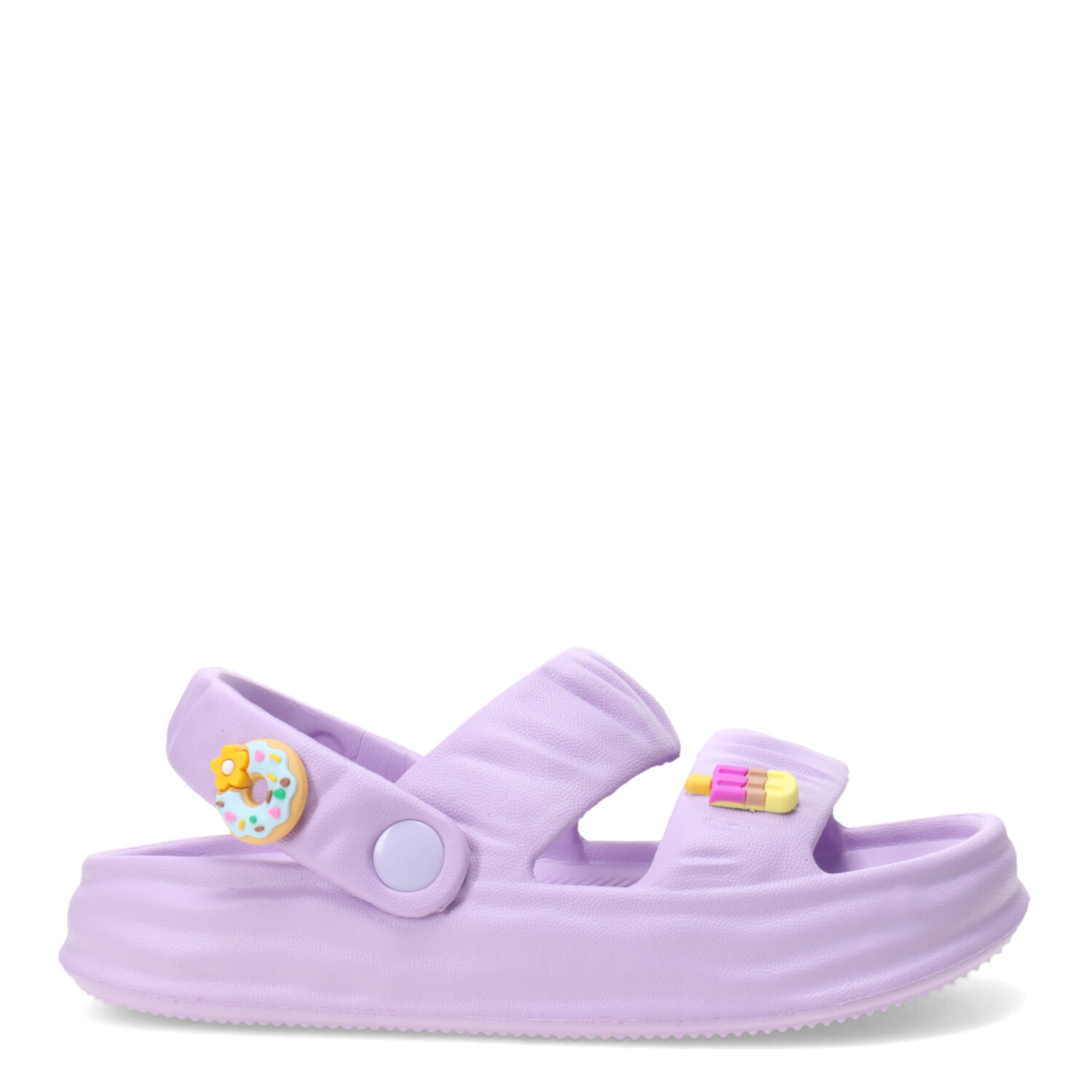 Las Mini Miss Carol PARCO son las sandalias ideales para acompañar a las más chicas en sus días de juego y diversión. Fabricadas en goma liviana y resistente, ofrecen comodidad y seguridad en cada paso. Su diseño en color lila con detalles de heladitos decorativos les da un estilo tierno y alegre, perfecto para el verano.